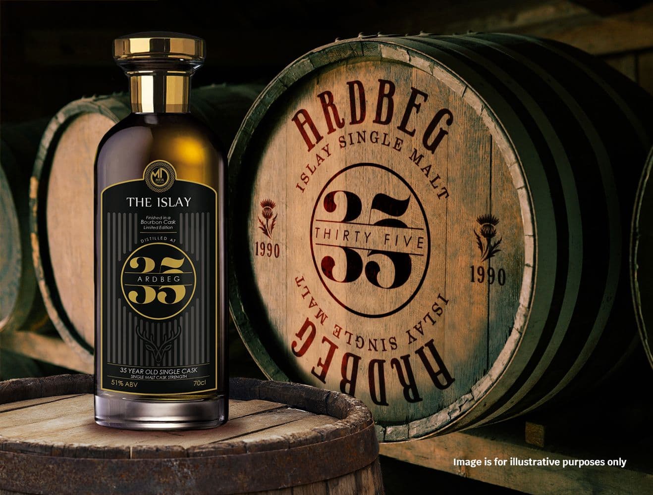 Meta Dram facilitates tokenised ownership of rare whisky casks. This Ardbeg 35-year-old cask was distilled in 1990 and matured on Islay; it is held in HMRC-bonded storage and offered as fractional token ownership.